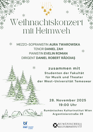 Institutul Cultural Român de la Viena vă invită vineri, 28 noiembrie, ora 19.00, la concertul de colinde „Colind cu dor de-acasă", organizat în parteneriat cu Facultatea de Muzică și Teatru a Universității de Vest din Timișoara, un eveniment dedicat celebrării tradițiilor de iarnă.